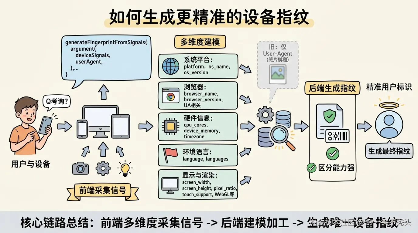 设备指纹能区分设备,靠的不是某一个特殊字段,而是这套组合拳: