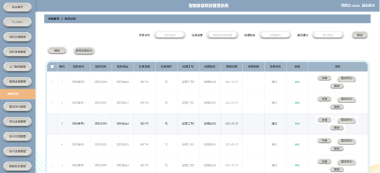 该系统的核心内容是对系统首页、个人中心、项目经理管理、项目信息管理、上门勘测管理、勘测进度管理、图纸深化管理、深化进度管理、技术交底管理、技术进度管理、隐蔽验收管理、验收进度管理、安装调试管理、安装进度管理、竣工验收管理、竣工进度管理、施工日志管理模块的管理。有关的智能家居项目管理系统规定如下: