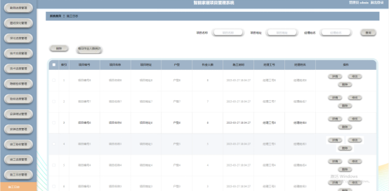 管理员点击施工日志管理。在施工日志页面输入项目名称、项目地址和经理姓名进行查询、每日作业人数统计或删除施工日志列表,并根据需要对施工日志详情信息进行详情、修改或删除操作;如图5-11所示: