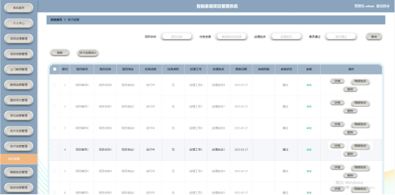 管理员点击技术进度管理。在技术进度页面输入项目名称、经理姓名、选择任务进度或是否通过进行查询、技术进度统计或删除技术进度列表,并根据需要对技术进度详情信息进行详情、隐蔽验收或删除操作;如图5-7所示:
