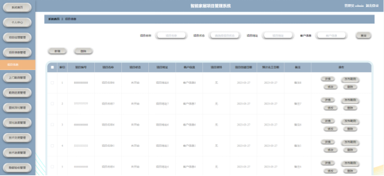 管理员点击项目信息管理。在项目信息页面输入项目名称、项目地址、客户信息和选择项目状态进行查询、新增或删除项目信息列表,并根据需要对项目详情信息进行详情、发布勘测、修改或删除操作;如图5-4所示: