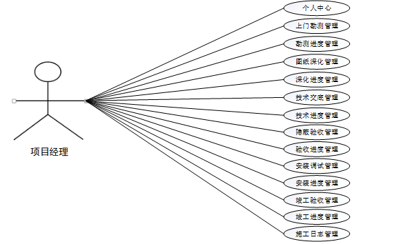 项目经理登入使用本系统涉到的功能主要有个人中心、上门勘测管理、勘测进度管理、图纸深化管理、深化进度管理、技术交底管理、技术进度管理、隐蔽验收管理、验收进度管理、安装调试管理、安装进度管理、竣工验收管理、竣工进度管理、施工日志管理等功能。项目经理用例如图3-2所示。