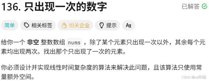 但题目存在一个需要使用常量空间的限制条件(当然上述方法是可以过题的),若要满足该要求,显然是不能使用容器来统计数据个数的方法的。此时,便需要运用到位运算的知识:对于两个相同的数进行异或,结果为0;任何数与0异或,数值不变 。那么将数组中所有的元素进行异或到一起呢,显然最后仅出现一次的数会留下来 ,而其余两两相同的数则会因为异或而消除。