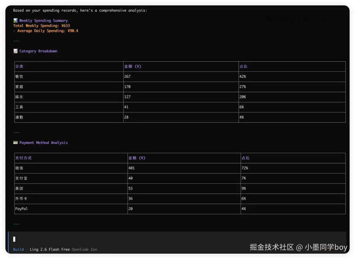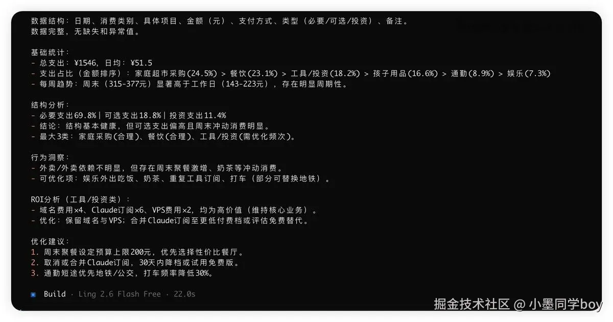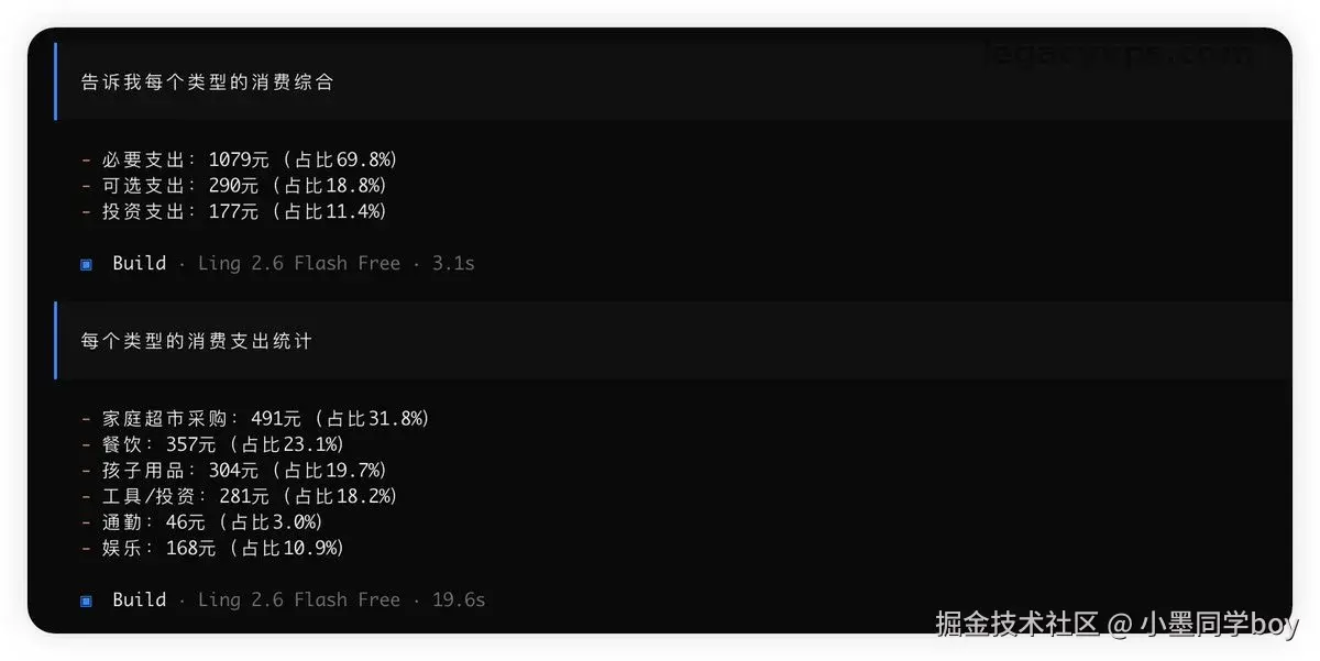 我跑了几天才得出的结论,不然怕自己只是新鲜感。这一周里我把日常那几类活全部切到 Ling-2.6-flash 上,深度模型只在我真要分析"我钱花得怎么样"的时候才开。