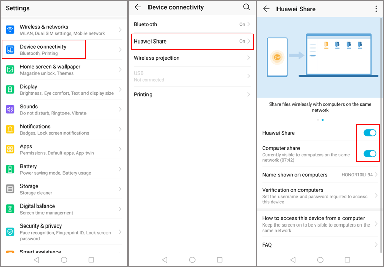 - 打开华为手机设置 →设备连接 →开启华为分享 ,并打开电脑端共享