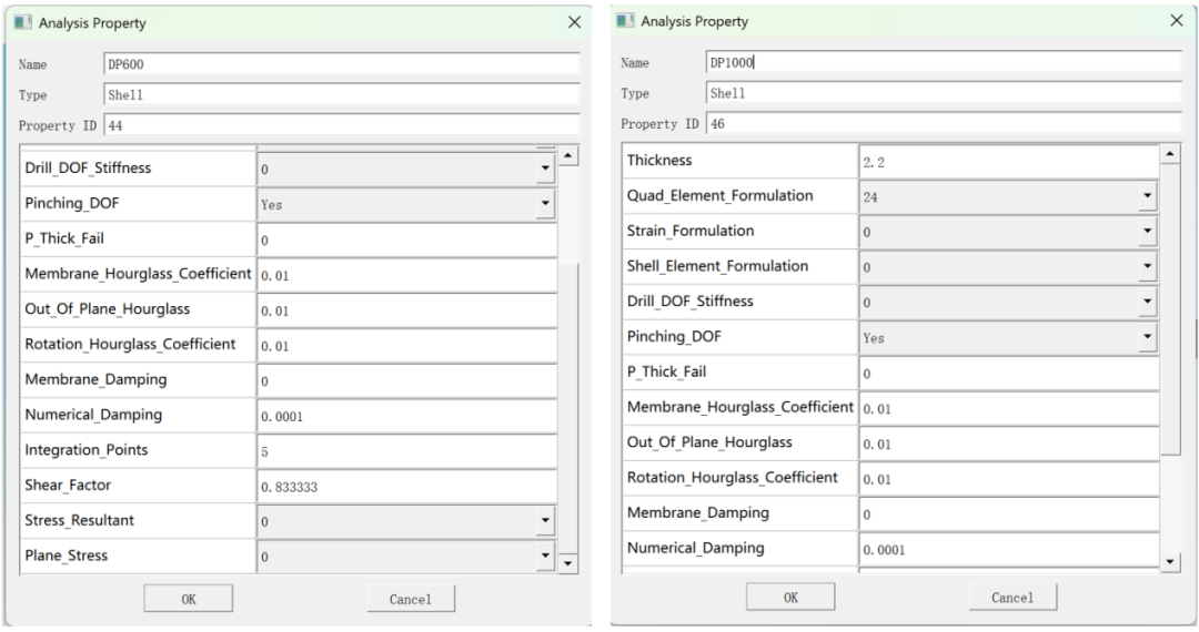 点击菜单栏>【Property】>【Property】,弹出属性类型选择窗口,具体操作如下图8所示,或者通过属性树创建。本例为两种材料分别创建了壳属性,主要区别在于厚度(DP600为1.8 mm,DP1000为2.2 mm),其余参数如积分点数(5)和剪切因子(0.833333)均相同,具体见下图9所示。