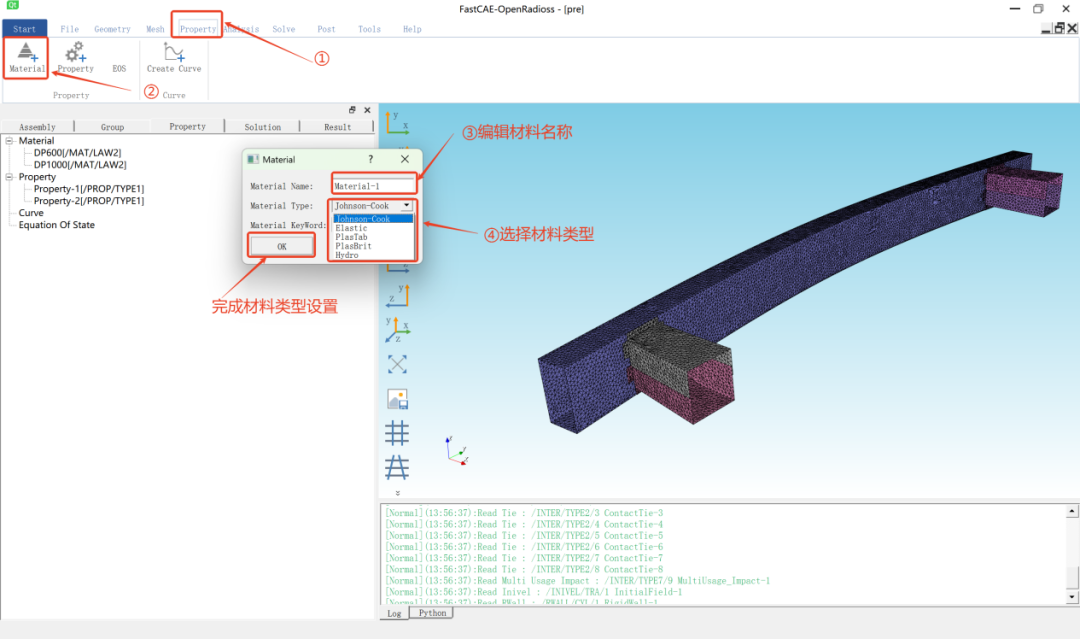 点击菜单栏>【Property】>【Material】,弹出材料类型选择窗口,具体操作如下图4所示,或者通过属性树创建。本例中设置了DP600和DP1000两种材料,均采用Johnson-Cook模型的各向同性弹塑性材料。