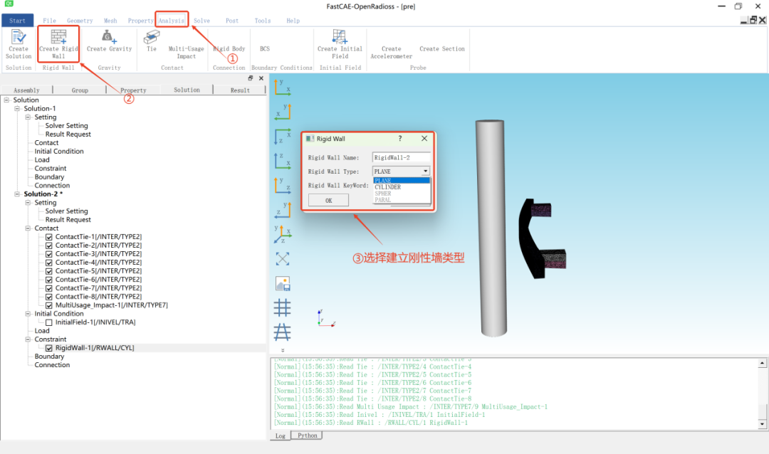 点击菜单栏>【Analysis】>【Create Rigid Wall】,然后选择刚性墙类型,软件提供了平面和圆柱两种类型,这里选择圆柱,见下图10所示。刚性墙具体参数设置见下图11所示。