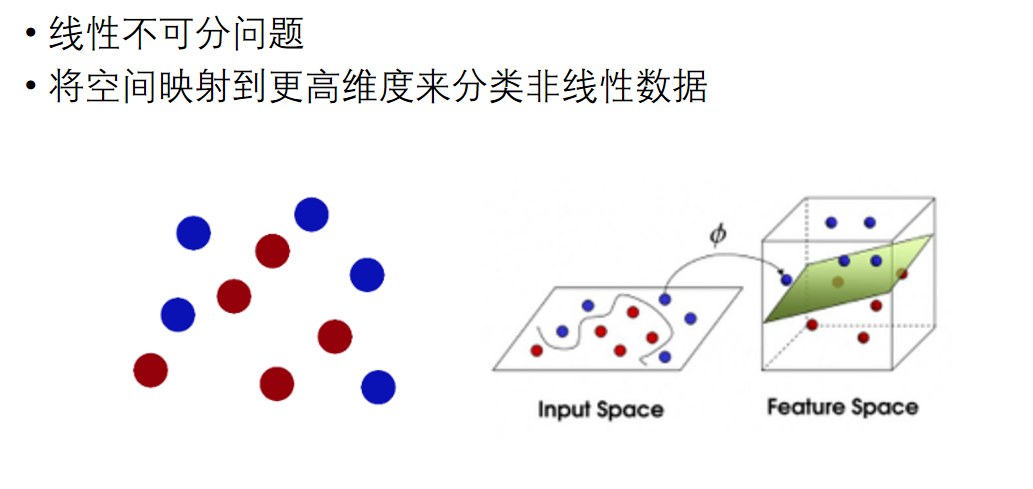 那么支持向量机则是通过升维的思想,认为低纬的线性不可分的点变成高维可分的