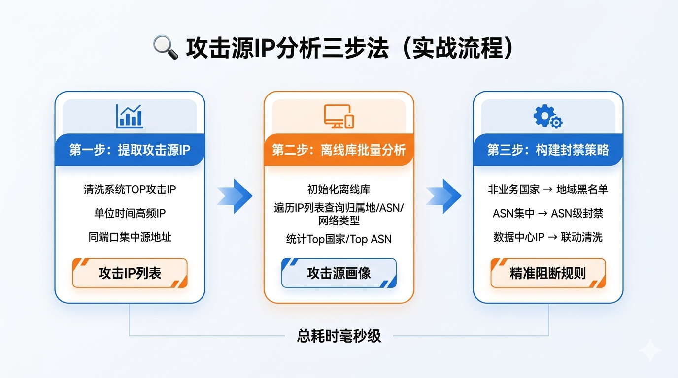 DDoS攻击应急响应中,快速分析攻击源的地域分布、网络归属和ASN组织 ,是制定阻断策略、缩短攻击影响窗口的核心能力。上述实战方案的关键在于批量提取攻击日志→本地离线库解析攻击源画像→针对性制定封禁策略,核心逻辑只需几行代码,却能显著提升应急响应效率。