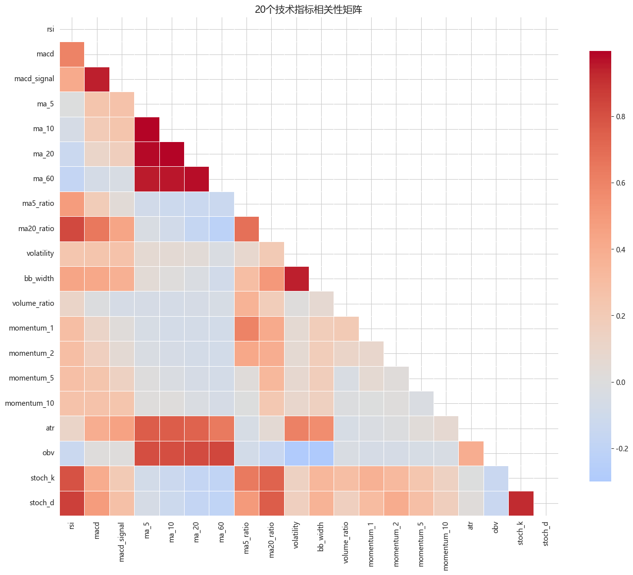 保留的特征: ['rsi', 'macd', 'macd_signal', 'ma_5', 'ma_10', 'ma_20', 'ma_60', 'ma5_ratio', 'ma20_ratio', 'volatility', 'bb_width', 'volume_ratio', 'momentum_1', 'momentum_2', 'momentum_5', 'momentum_10', 'atr', 'obv', 'stoch_k', 'stoch_d']
