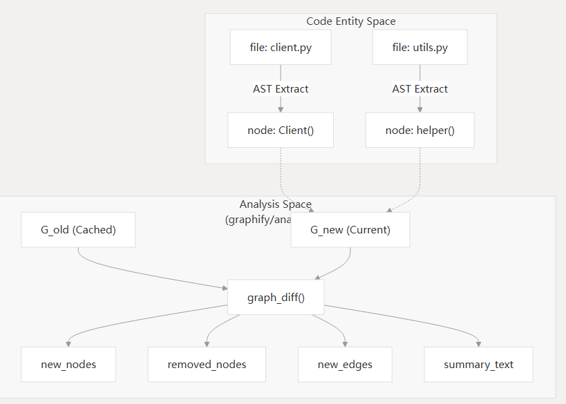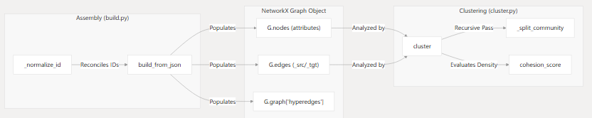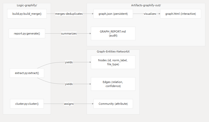 以下图示将 GRAPH_REPORT.md(如 worked/ 目录中生成的报告)中的高层概念映射到生成它们的特定 Python 类和函数。