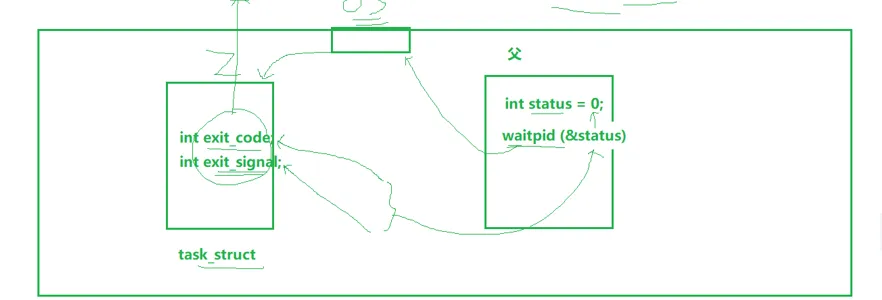 当父进程调用这个 waitpid的时候,调用了系统调用,OS去这个子进程的task_struct里面去拿到这两个变量。然后返回到这个 status 里面。
