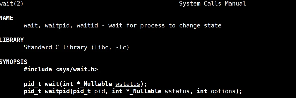 可以看到这个参数就是有四个返回值,前面 <= -1 的,我们先不管。然后呢,当等待成功,返回 pid ,当等待失败返回0。