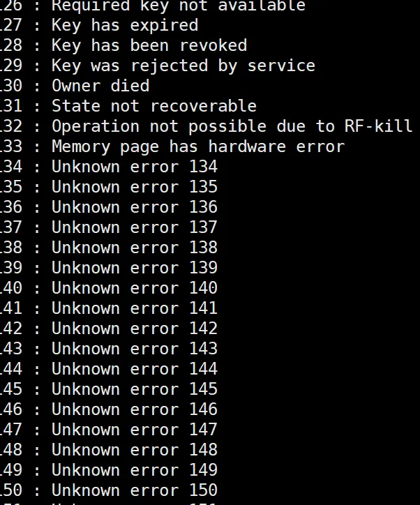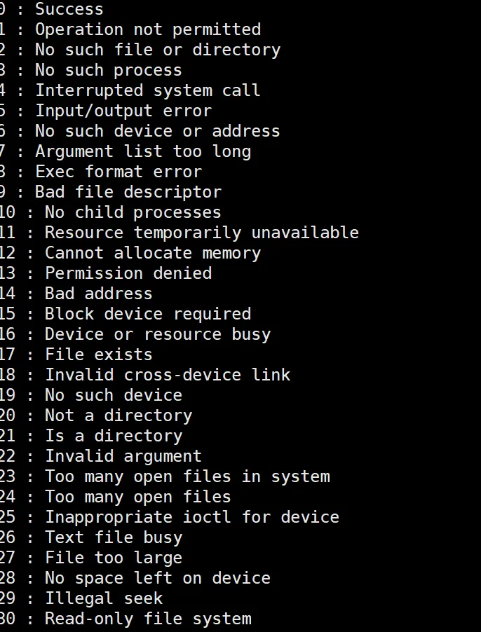 可以看到,这个退出码都对应着不同的错误,当退出码是 0 的时候,是成功。 在linux里面,有意义的退出码一共是134个。