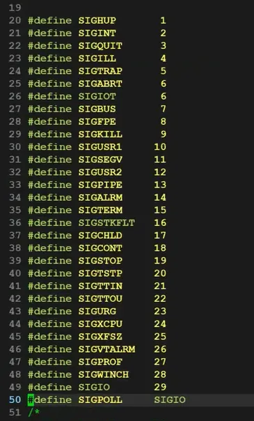 说到这里呢,就要来谈谈这个信号了。记得我们之前用过的信号 kill -9 或者说 -18 -19,那么信号是什么呢?信号其实也是一个宏,就是一个整数,来看: