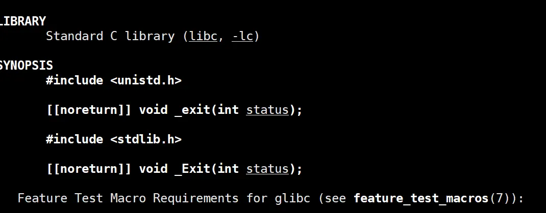 看起来这个 _exit 和 exit 使用上没什么区别。实际上是有的。 _exit 是系统调用, exit 就是封装了这个 _exit 才实现退出的,除此之外还做了一些其它的事情, 比如说,这个执行用户通过通过这个 atexit 或者 on_exit 定义的清理函数,关闭所有打开的流,刷新缓冲区,最后再调用 _exit。 _exit 就是直接就退出了。