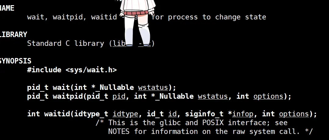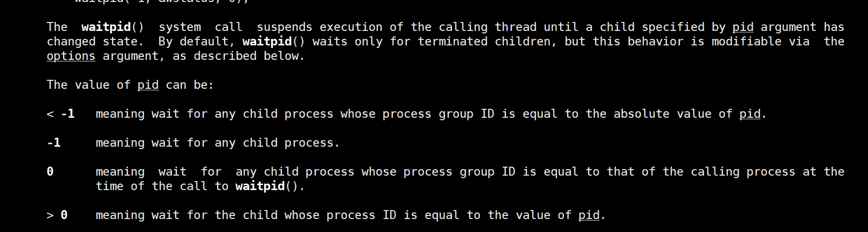 这个 waitpid 呢,就是等待特定的进程,传入 pid 就好。 如果第一个 pid 参数传 -1 的话,效果就和 wait 就一样了。