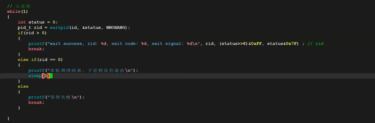 所以,这个WNOHANG的选项就是让父进程在等待的过程中可以做自己的事,然后通过这个非阻塞轮询来等待这个子进程。这里用一个循环来实现就好。