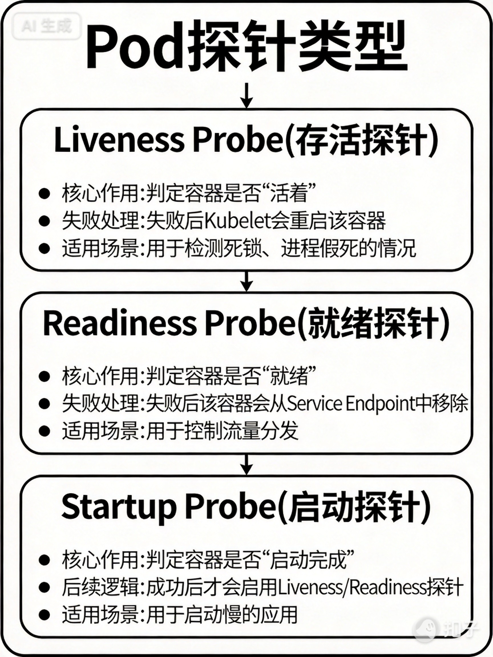 主动检测Pod内容器的健康状态,确保其真正可提供服务,而非仅进程存活。