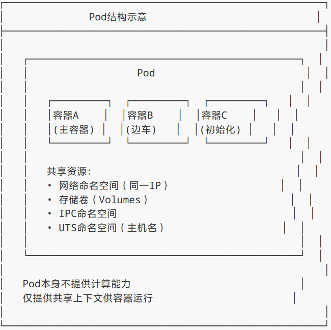 | Pod结构 | 最小部署单元、容器共享资源、三种特殊容器 |