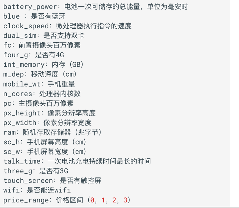 小明创办了一家手机公司,他不知道如何估算手机产品的价格。为了解决这个问题,他收集了多家公司的手机销售数据。该数据为二手手机的各个性能的数据,最后根据这些性能得到4个价格区间,作为这些二手手机售出的价格区间。主要包括: