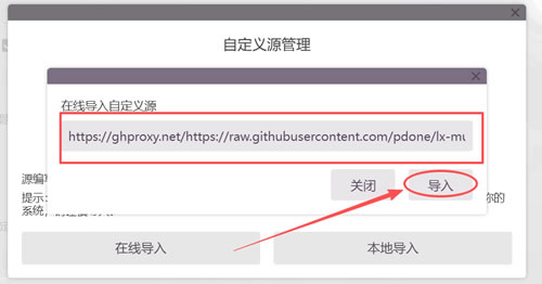 - 复制 https://ghproxy.net/https://raw.githubusercontent.com/pdone/lx-music-source/main/flower/latest.js 或者 https://tt.tenmeng.com/moonue/js/yecao202412.js ,粘贴到方框内,点击 "导入":