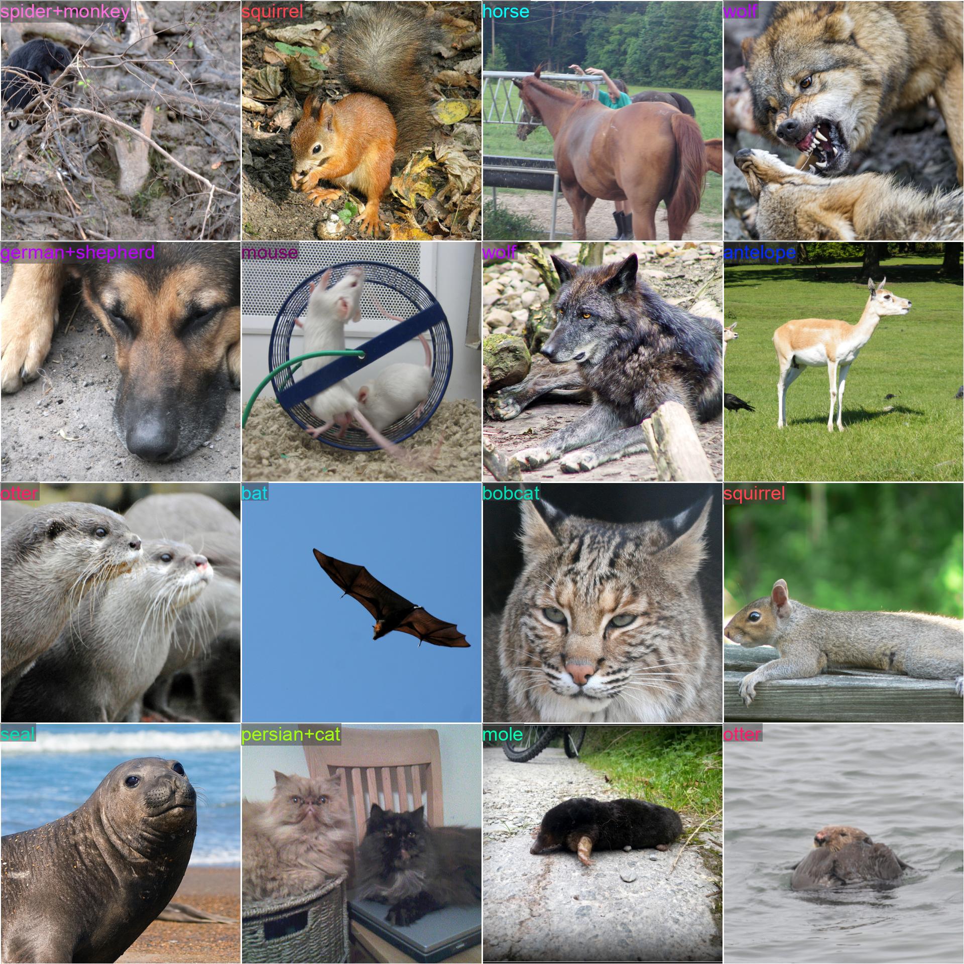 - **数据集类别:**antelope、bat、beaver、bobcat、buffalo、chihuahua、chimpanzee、collie、dalmatian、german+shepherd、grizzly+bear、hippopotamus、horse、killer+whale、mole、moose、mouse、otter、ox、persian+cat、raccoon、rat、rhinoceros、seal、siamese+cat、spider+monkey、squirrel、walrus、weasel、wolf 共 30 个类别;