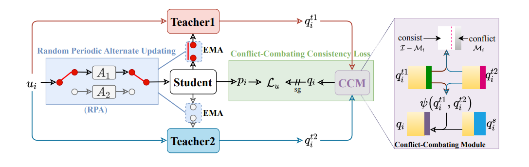普通 Mean Teacher 只有一个 teacher,容易产生错误伪标签并不断强化错误;而普通双教师又容易两个 teacher 太相似,所以作者提出让两个 teacher 交替、随机、差异化更新,并且让 student 学习两个 teacher 的一致区域和冲突区域。