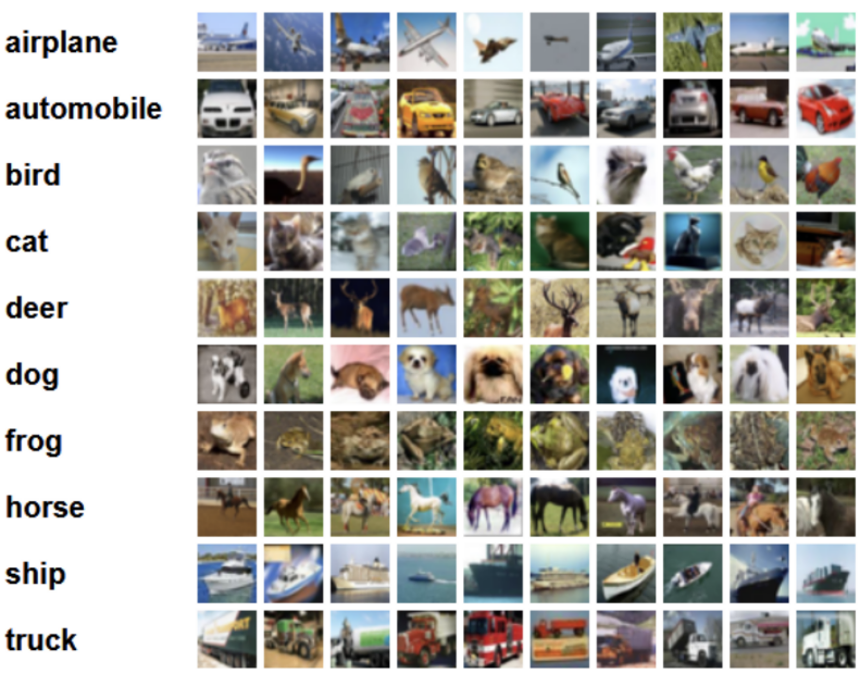 CIFAR-10数据集5万张训练图像、1万张测试图像、10个类别、每个类别有6k个图像,图像大小32×32×3。下图列举了10个类,每一类随机展示了10张图片: