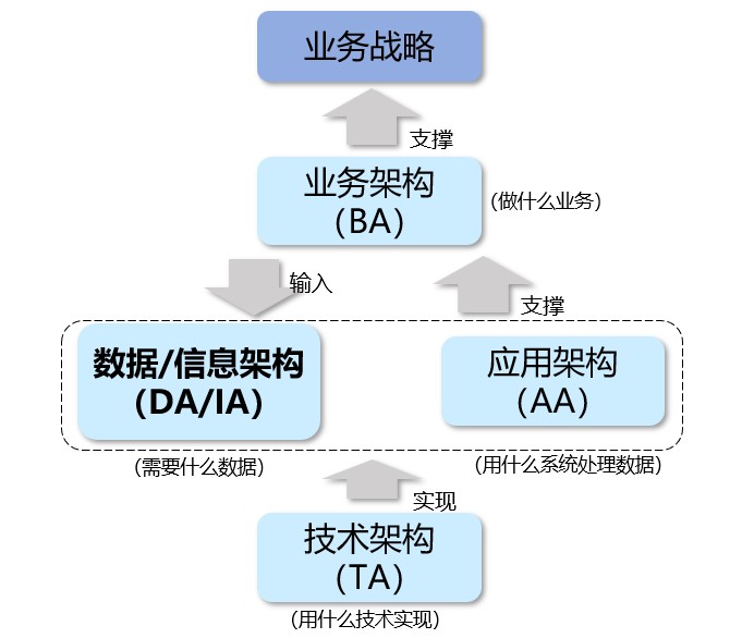 - **信息架构(IA/DA)**将业务需求转化为数据标准与模型,回答"需要什么数据"。