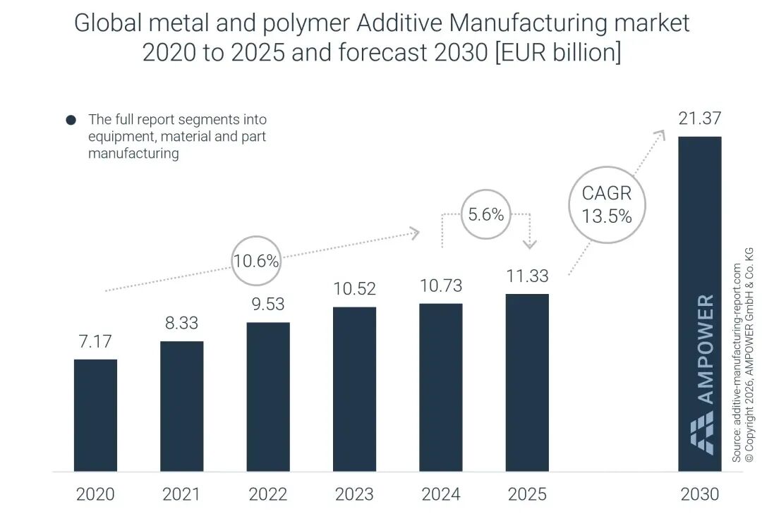 市场研究机构AMPOWER发布2026报告称,2025年全球工业金属与聚合物增材制造市场规模达113.3亿欧元,同比增长5.7%,涵盖设备、材料及零件制造供应商销售额。
