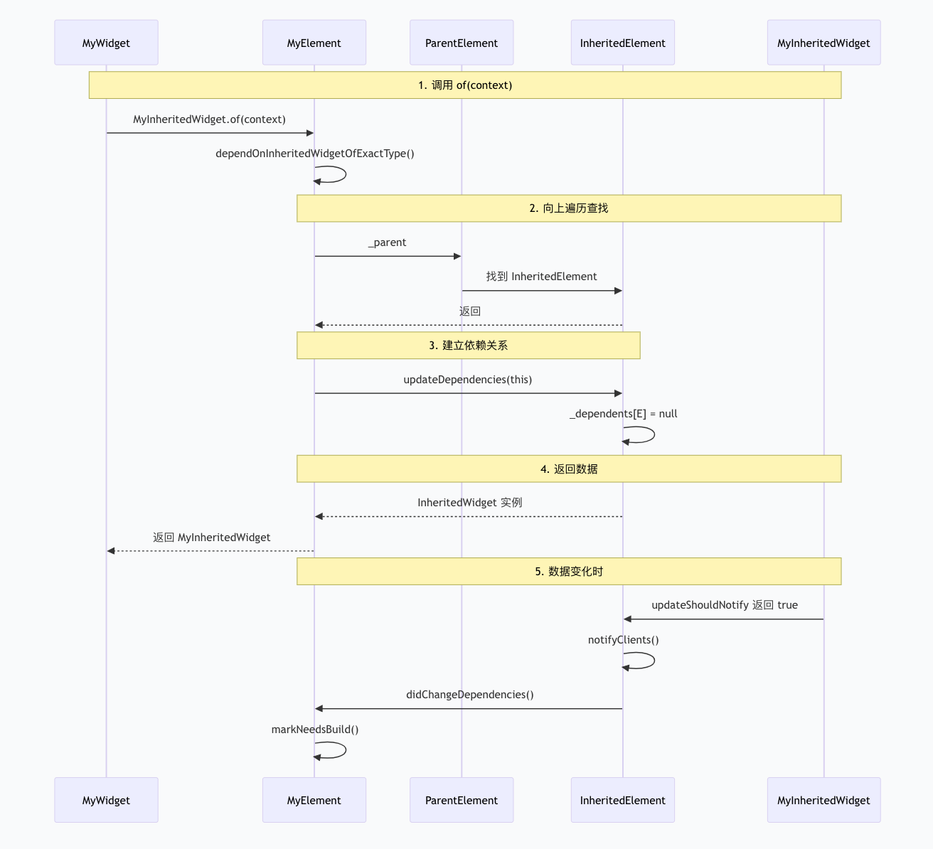 MyInheritedWidget.of(context) 的核心原理是向上遍历 Element 树 并建立依赖关系。