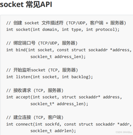 | 套接字类型 | SOCK_STREAM(流式) SOCK_DGRAM(数据报) SOCK_RAW(原始套接字) |