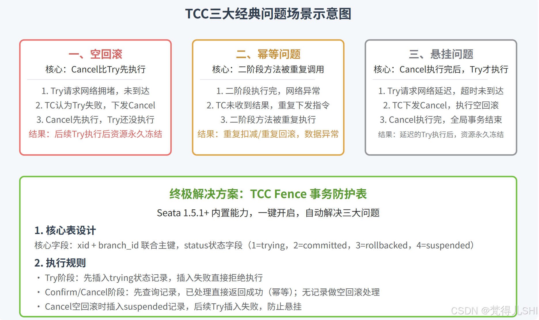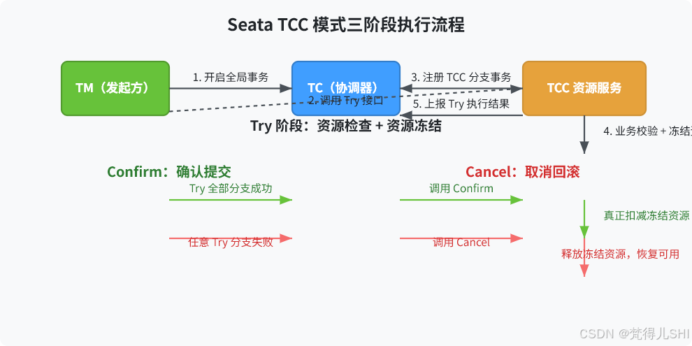 - Try/Confirm/Cancel 三个方法必须保证幂等性,严禁重复执行导致数据异常