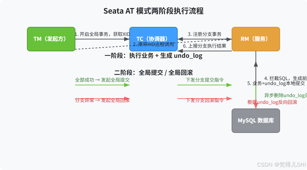- Seata AT 模式:一阶段就提交本地事务,释放本地锁,二阶段如果是提交,异步删除 undo_log 即可;如果是回滚,通过 undo_log 自动生成反向 SQL 补偿,锁持有时间极短,性能大幅提升