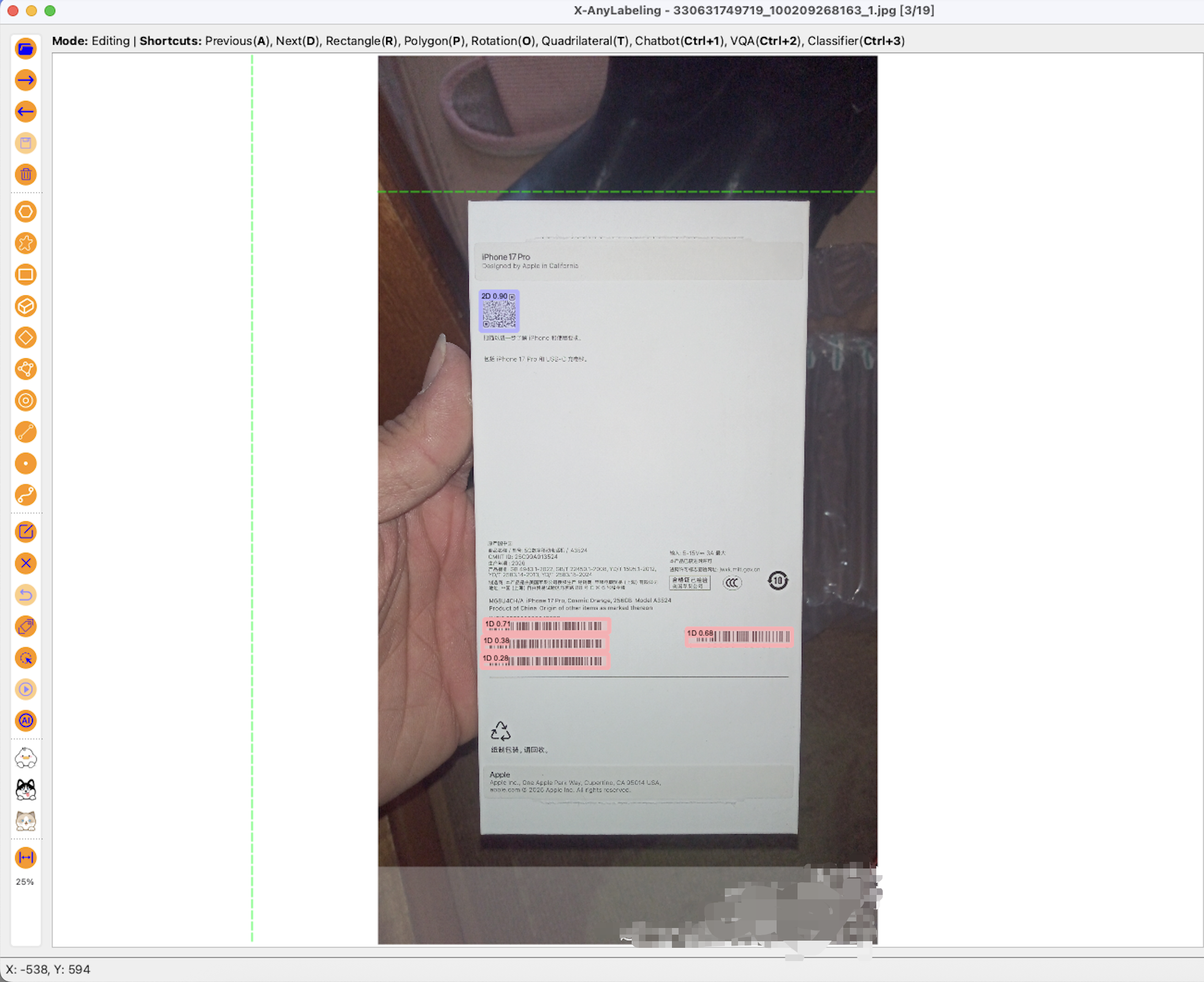 示例中标注了一个二维码、四个一维条码。标注完成的数据,可以直接导出为yolo格式的数据集。