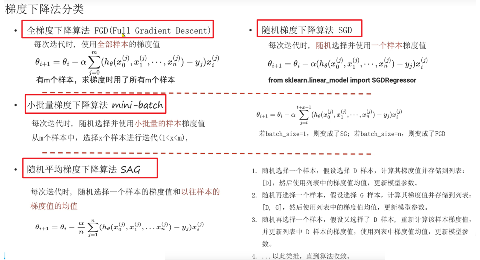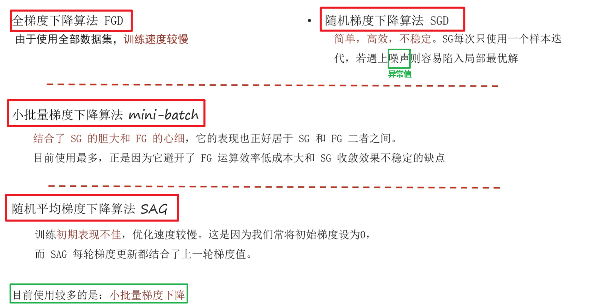 5️⃣ 总结:全梯度是一次用所有,随机是一次一个,小批量是一次一批(1<t<m),随即平均梯度是抽样本,将梯度加到列表中,算列表均值;)
