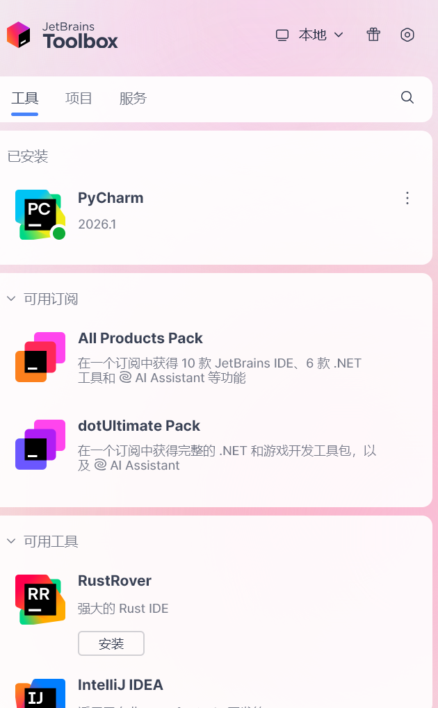 - 在「工具」标签页中,确认已安装好你需要的 IDE(如 PyCharm 2026.1)