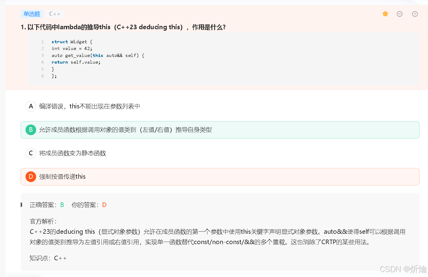让派生类把自己的类型,作为模板参数传给基类,基类再通过静态转换拿到派生类的实例,从而实现编译期的多态行为。在 C++23 引入 deducing this 之前,很多场景都得靠它来实现