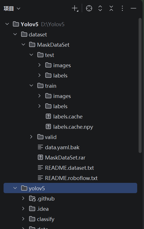 我的数据集存放在 D:\Yolov5\dataset\MaskDataSet\,结构如下: