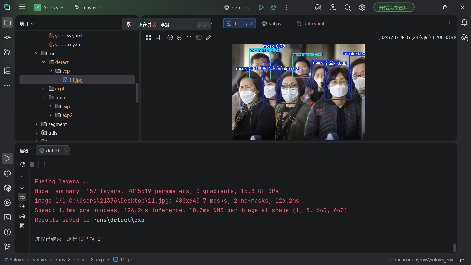 打开这张图片,你会看到原图上被标注了带置信度的检测框,框上显示类别名称(mask / no-mask)和概率。