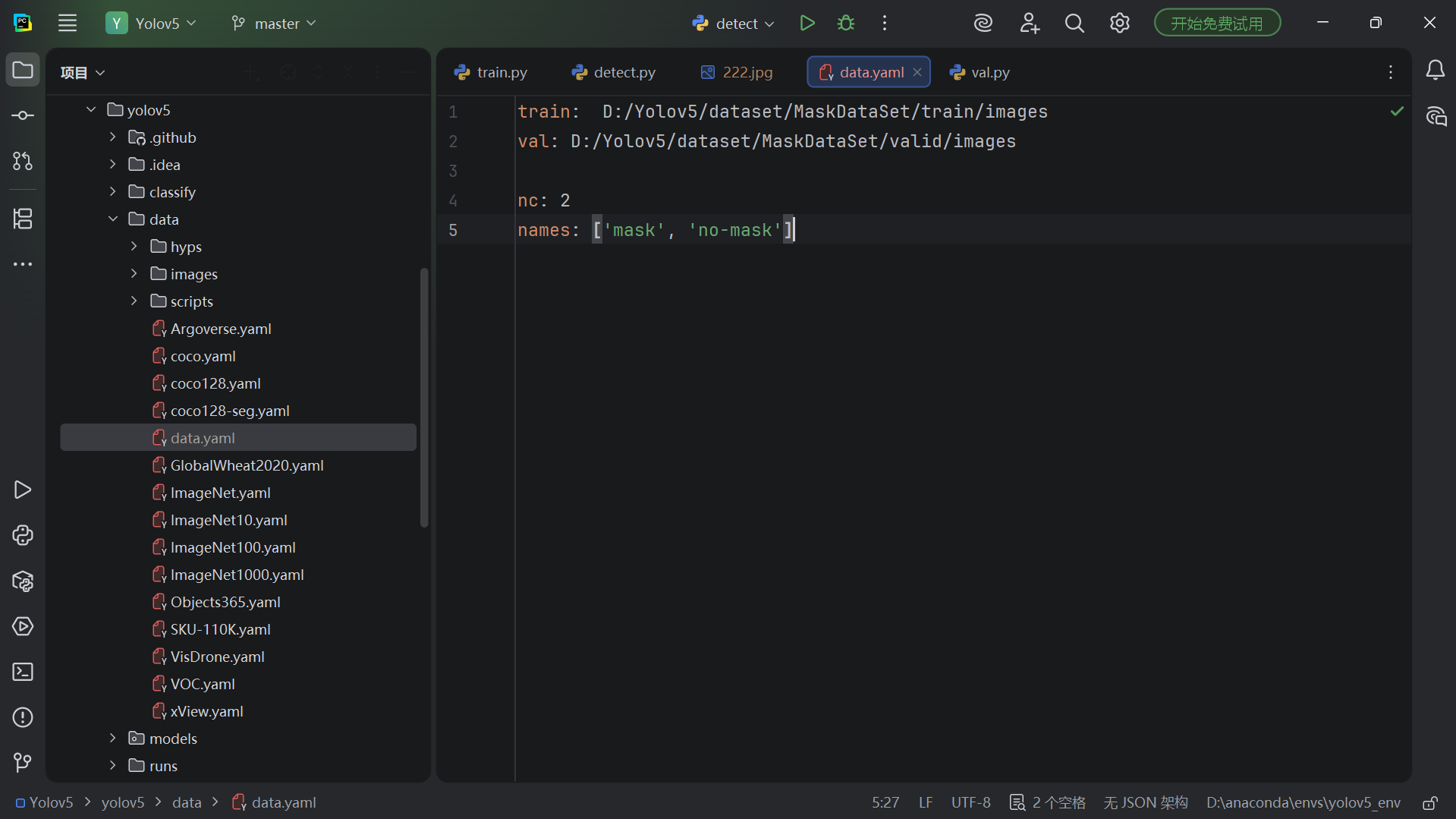 在 YOLOv5 项目根目录下的 data/ 文件夹中,新建一个文件,例如 mask_data.yaml(你也可以叫 data.yaml)。