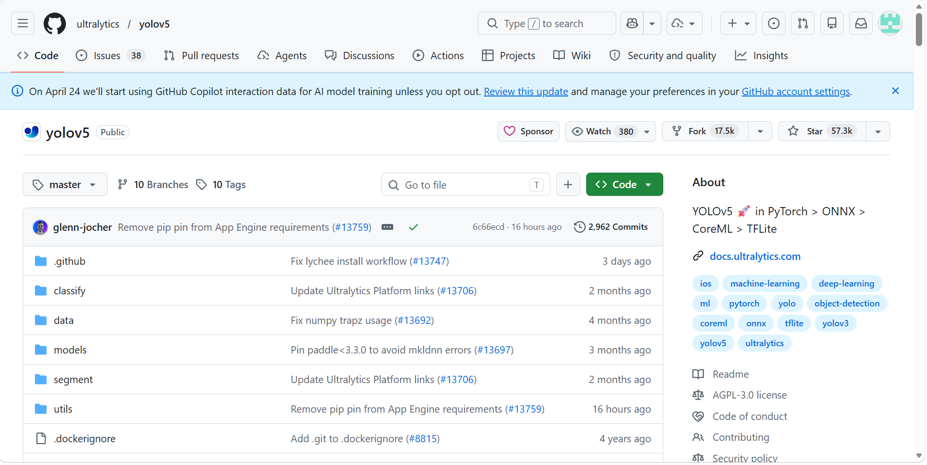 你会看到 YOLOv5 的官方主页,上面有代码文件、README 说明、以及最新的发布版本。
