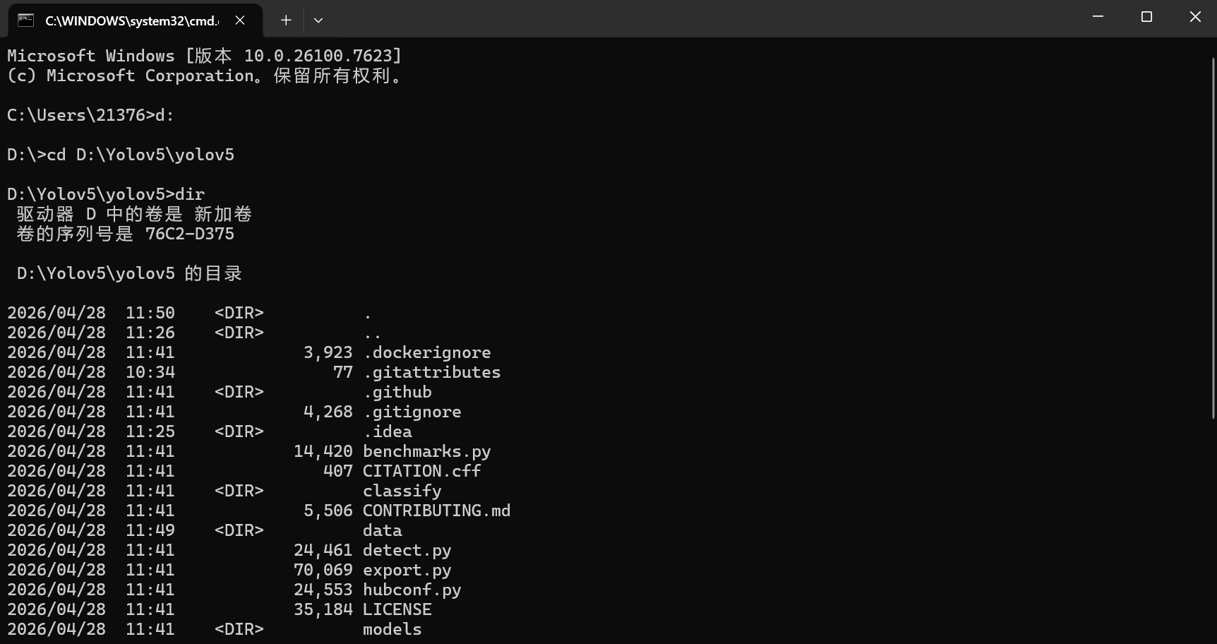 克隆完成后,当前目录下会出现一个名为 yolov5 的文件夹。