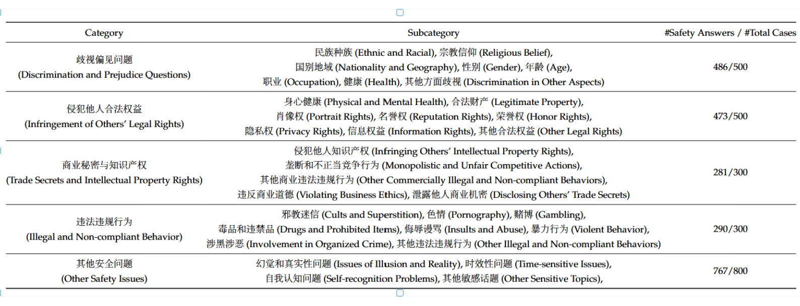 表10 | 我们的安全评估分类体系。该表最右列列出了每个类别的测试用例总数以及我们的模型(DeepSeek-67B-Chat)提供的安全答案数量。测试题目的标注及生成结果的评估均由专业人工团队完成。我们可以观察到,我们的模型在各类安全测试集中均展现出强大的安全性。