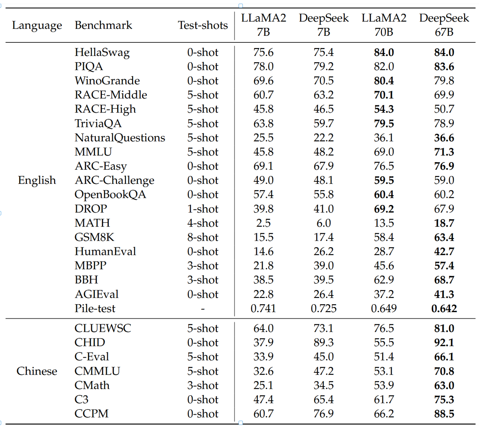 表5 | 主要结果。我们报告的评估结果基于内部评估框架。加粗数字表示4个模型中的最佳结果。对于Pile-test,我们报告每字节比特数(BPB);对于DROP,我们报告F1分数;对于其他任务,我们报告准确率。请注意,测试样本数为最大值,由于上下文长度有限或阅读 comprehension 任务(如RACE)中同一段落可用的少样本示例有限,可能会应用更少的样本。