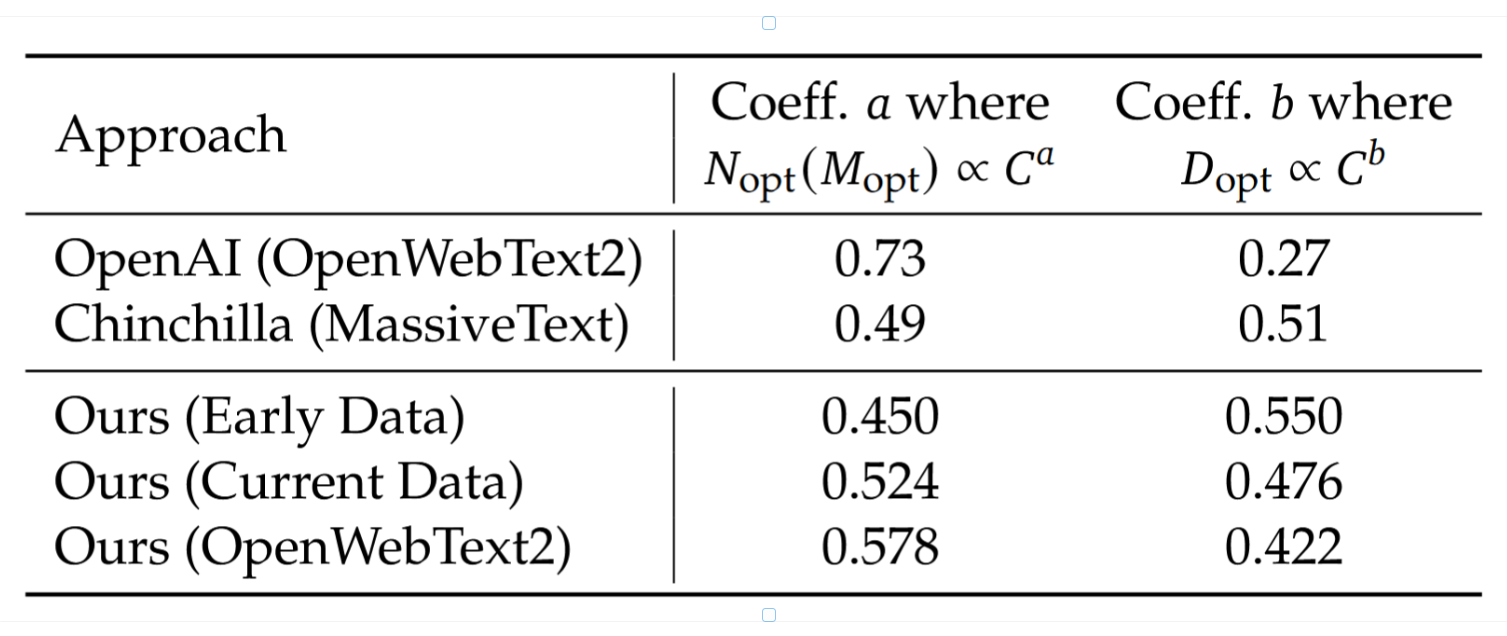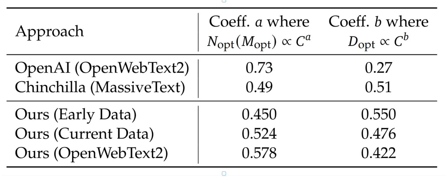 表 4 | 模型缩放系数与数据缩放系数随训练数据分布的变化。