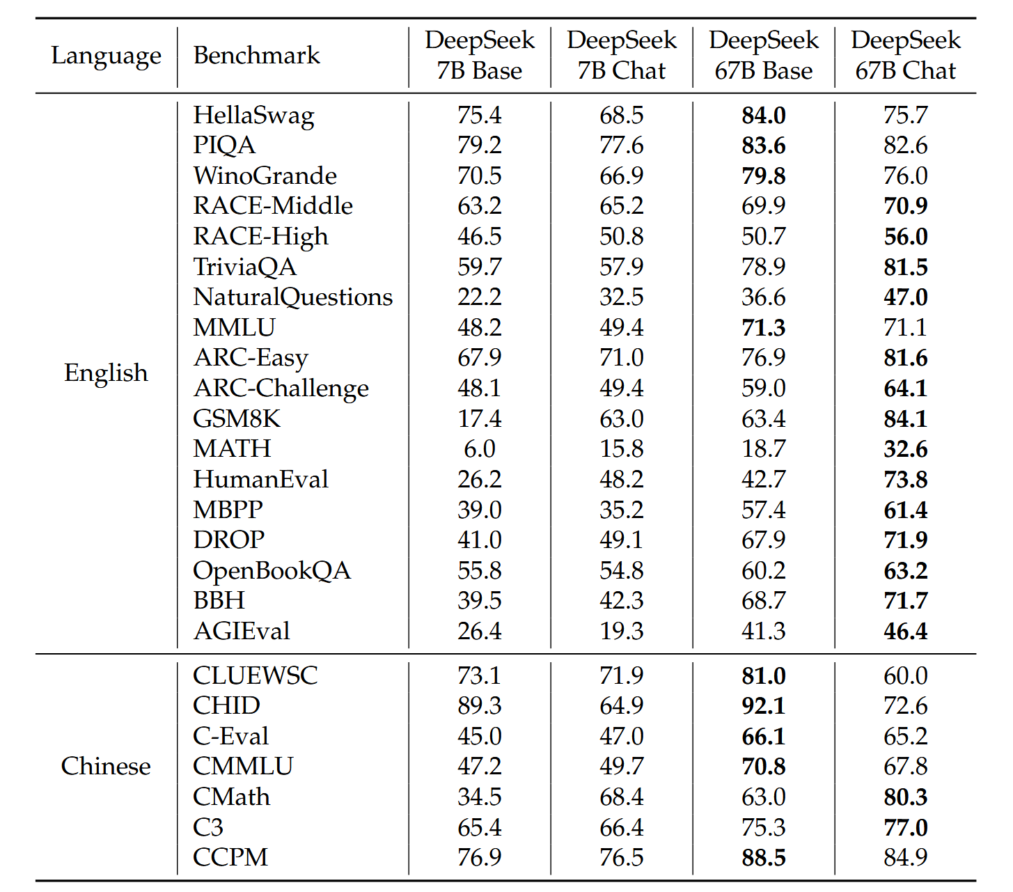一个有趣的观察是,DeepSeek 67B相对于LLaMA2 70B的优势大于DeepSeek 7B相对于LLaMA2 7B的优势。这一现象突显了语言冲突对较小模型影响更大。此外,尽管LLaMA2并未针对中文数据进行专门训练,但它在某些中文任务(如CMath)上表现出色。这表明某些基本能力(例如数学推理)可以有效地跨语言迁移。然而,像CHID这类涉及评估中文成语使用情况的任务,要求模型在预训练期间消耗大量中文词元。在此情况下,LLaMA2的表现显著逊于DeepSeek LLM。