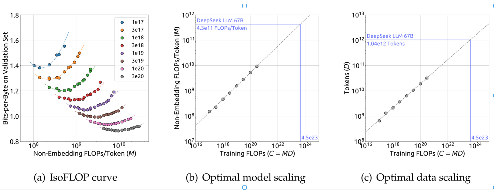 图4展示了IsoFLOP曲线以及模型/数据缩放曲线,这些曲线是通过对每个计算预算采用最优模型/数据分配进行拟合得到的。最优非嵌入FLOPs/词元MoptM_{opt}Mopt与最优词元数DoptD_{opt}Dopt的具体公式如下: